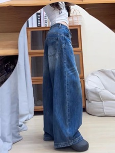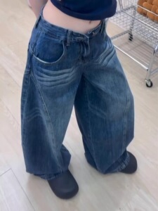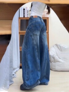美式水洗弯刀阔腿牛仔裤女秋季新款宽松显瘦垂感直筒拖地阔腿裤子
