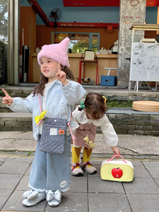 秋季2025新款女童蓝色格子韩系可爱外套牛仔裤套装