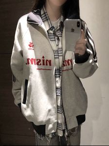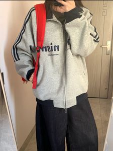 国潮牌灰色三条杠翻领无帽卫衣女春秋薄款宽松高级感开衫拉链外套