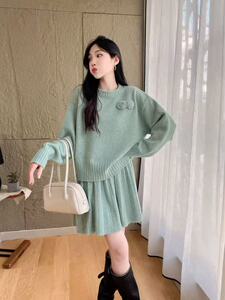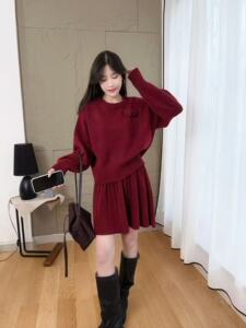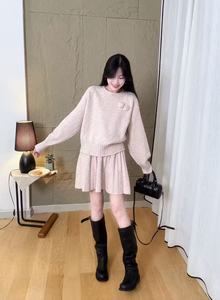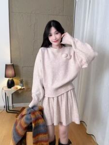 设计感立体花朵针织套装女2025秋冬新款韩版圆领毛衣百褶裙两件套