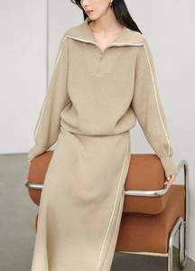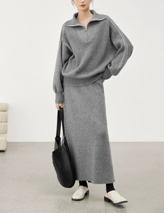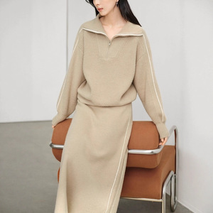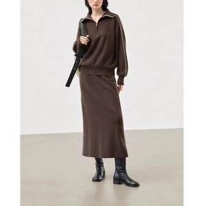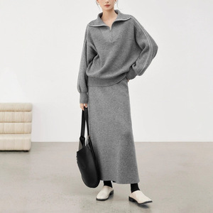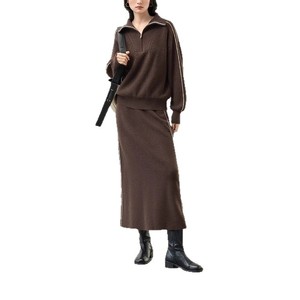 2025秋冬新款针织套装女半拉链翻领撞色套头上衣+高腰半身裙2件套