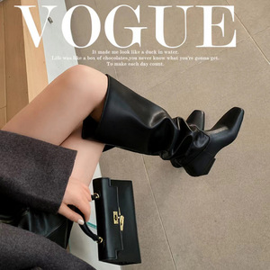 真皮法式方头平底过膝靴膝上靴宽筒宽松堆堆微胖高筒长筒靴女