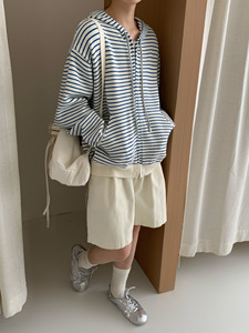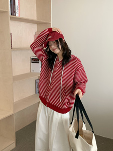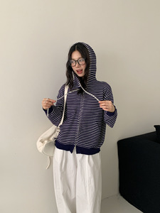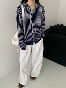 慵懒风宽松连帽拉链开衫毛衣女秋冬外穿2025新款韩系条纹针织外套