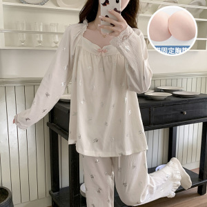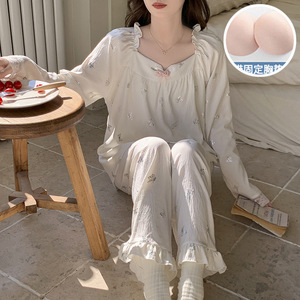 带胸垫睡衣女款春秋季甜美公主风薄款长袖长裤宽松少女家居服套装