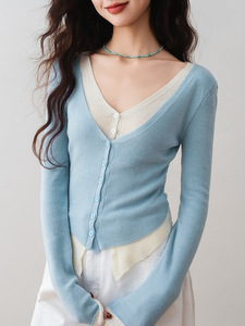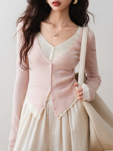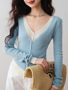 ron韩系假两件撞色针织开衫2025秋新款气质修身收腰v领上T