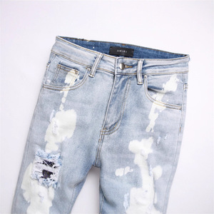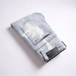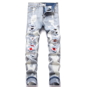 AM欧货男士浅蓝色牛仔裤破洞弹力修身红色乞丐百搭外贸男长裤3879