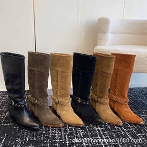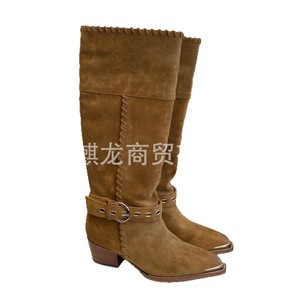 高端2025秋冬磨砂牛皮尖头复古粗跟皮带扣高筒骑士靴不过膝长靴女