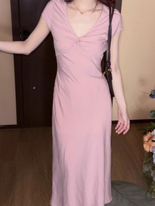 人棉斜裁修身收腰连衣裙2025夏新品V领气质粉色长裙设计感短袖潮