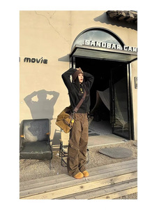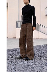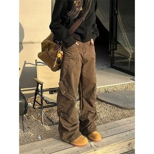 新款褶皱多口袋美式高街复古工装裤女宽松直筒裤子潮休闲阔腿裤男