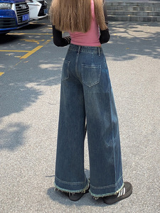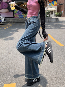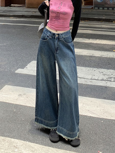 复古美式阔腿牛仔裤女2025夏秋高腰宽松显瘦流苏毛边复古直筒裤