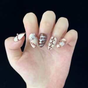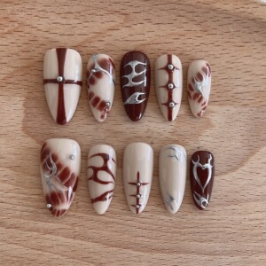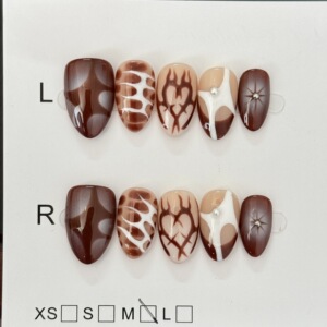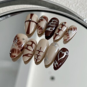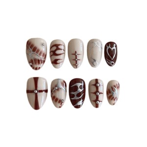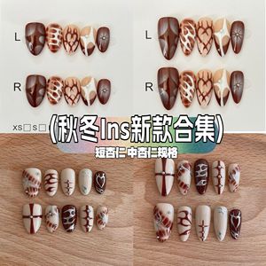 新款海外爆款辣妹秋冬咖色系列网红杏仁纯手工彩绘火焰穿戴甲