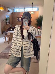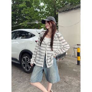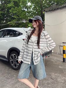 【工厂现货】复古条纹连帽外套女薄款长袖防晒开衫慵懒风宽松上衣