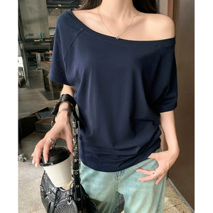 韩系ins风斜肩露肩小上衣T恤宽松显瘦辣妹短袖夏天百搭超好看上衣