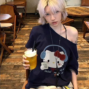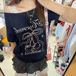 斜肩T恤纯棉-藏青色KT蝴蝶结