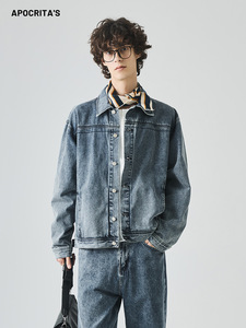 APO男装|跨境男士牛仔外套秋季美式高街潮牌水洗宽松翻领夹克上衣