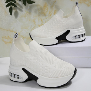 跨境飞织透气大码坡跟运动休闲鞋2025秋季新款厚底松糕单鞋女wish