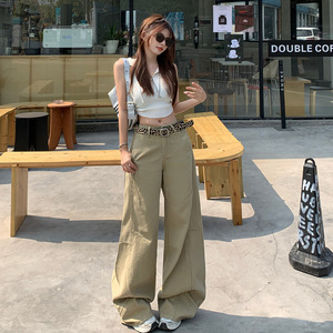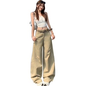 美式复古卡其色牛仔裤2025新款设计感拼接宽松阔腿直筒长裤批发