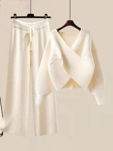 女士优雅针织秋冬两件套个性交叉设计宽松针织上衣加纯色宽松长裤