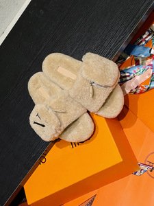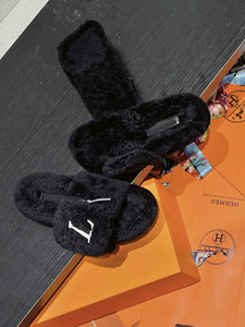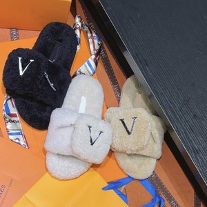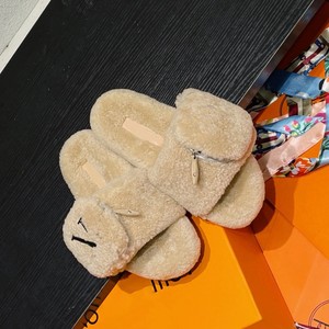 渠道版!羊羔毛魔术贴毛毛鞋女士外穿秋冬新款字母刺绣一字拖棉拖