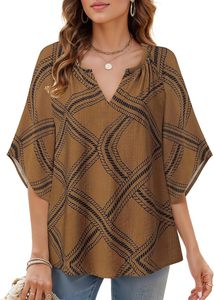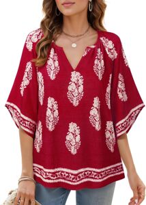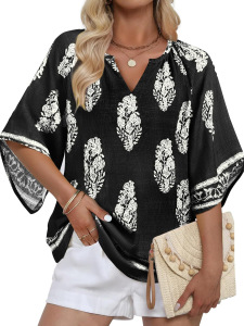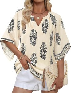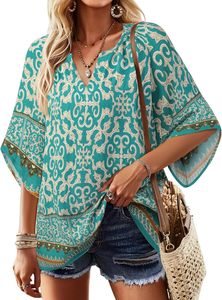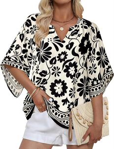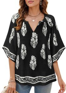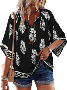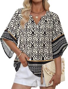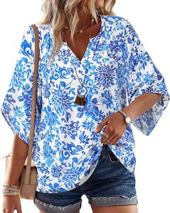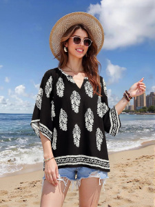 欧美跨境V领印花波西米亚田园风休闲宽松夏季上衣7分袖女士