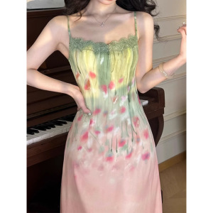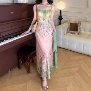 法式复古气质方领吊带裙秋夏温柔风高腰露背碎花连衣裙女
