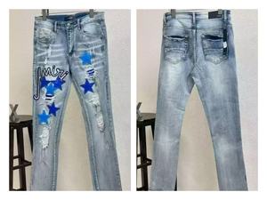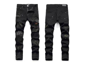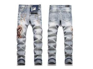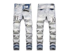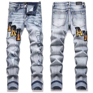 25跨境欧美潮牌amri刺绣破洞贴布休闲弹力牛仔长裤男女高街牛仔裤