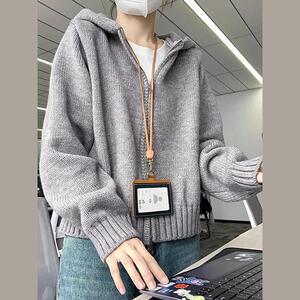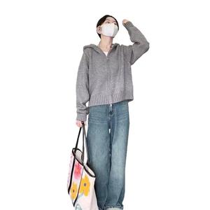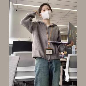 灰色连帽双拉链毛衣外套女春秋冬2025新款复古慵懒风宽松针织开衫