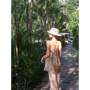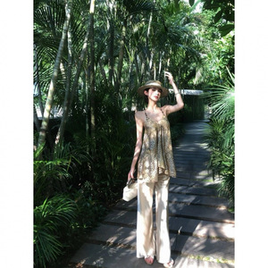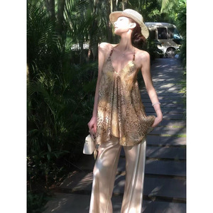 法式度假风慵懒V领豹纹挂脖背心女夏季新款气质宽松无袖外穿上衣