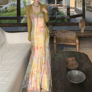 设计感甜美套装女秋秋季荷叶边长袖开衫收腰鱼尾吊带连衣裙两件套