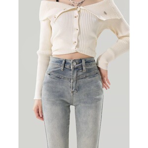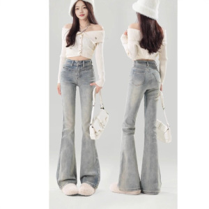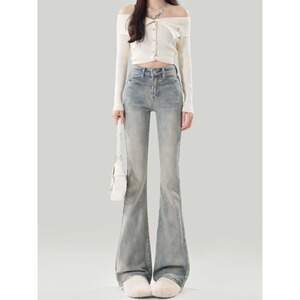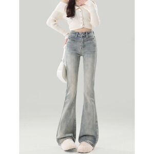复古高腰微喇牛仔裤女2025春秋新款辣妹弹力修身马蹄喇叭长裤子潮