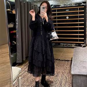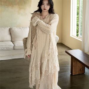 流浪风气质V领蕾丝不规则花边拼接重工连衣裙秋冬内搭长裙仙女裙
