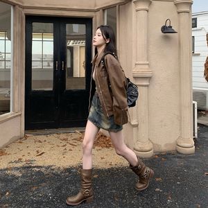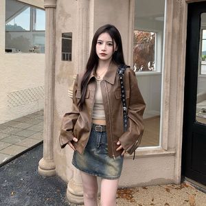 2025冬季超火外套皮衣女棕色春秋皮衣美式皮夹克开春感外套女