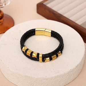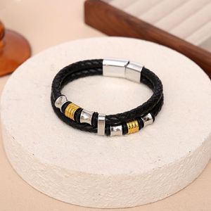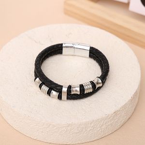 跨境真皮编织手链男士时尚磁铁扣皮革手镯两层串珠复古潮流手链