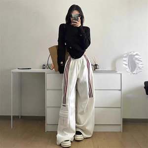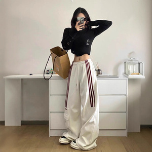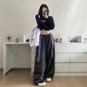 美式复古深灰休闲卫裤女潮牌松紧腰抽绳阔腿裤三条杠爵士舞束脚裤