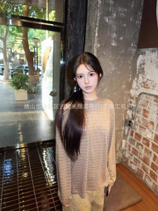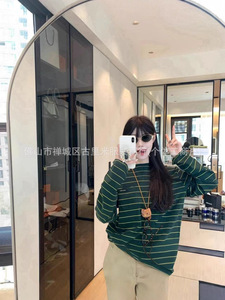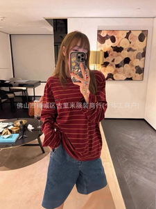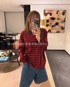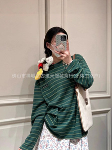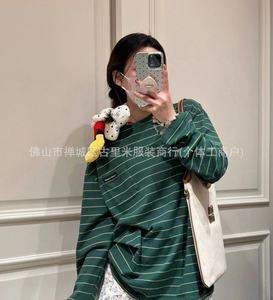 2025年秋季新款小众复古拼色字母贴布刺绣条纹宽松T恤女百搭上衣