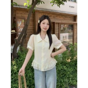 实拍2025夏季新款胖mm大码法式娃娃领短袖衬衫减龄别致小衫64335