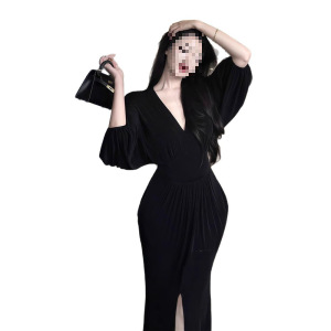 纯欲辣妹V领蓬蓬袖开叉连衣裙女夏季新款修身显瘦高级感包臀长裙