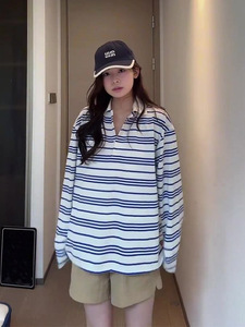 美式复古蓝色条纹polo领长袖T恤女夏季薄款外搭宽松防晒罩衫上衣