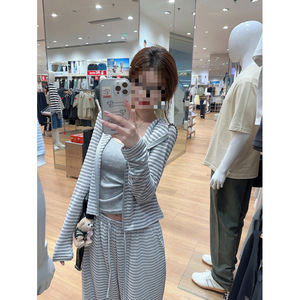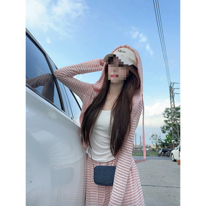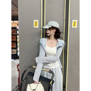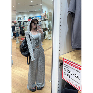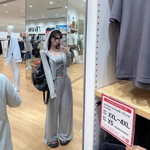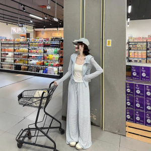 甜辣妹条纹轻薄连帽防晒开衫高腰阔腿休闲长裤女2025夏季新款套装