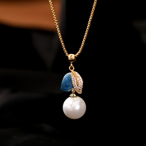 新款珐琅滴釉蓝色树叶项链简约轻奢施家澳白珍珠毛衣链气质锁骨链