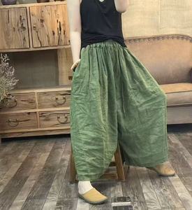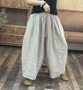 2025夏季韩版宽松个性亚麻炒色做旧松紧腰老爹裤百搭休闲九分裤女