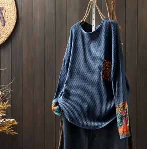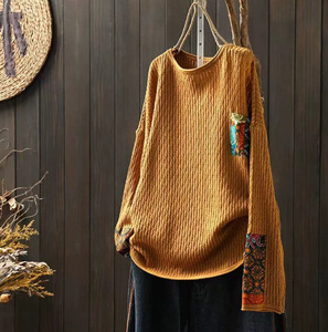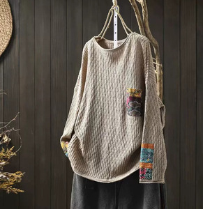 秋季新款 复古贴布棉线针织套头衫女圆领宽松休闲显瘦毛衣