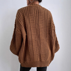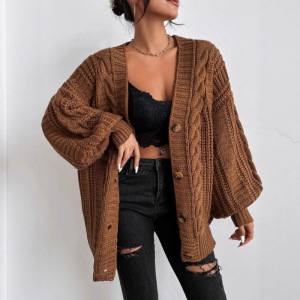 跨境V领毛衣女宽松休闲慵懒风粗针外套 秋冬季新款麻花中长款开衫