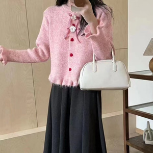 慵懒风木耳边蝴蝶结长袖针织开衫女秋季设计感花朵毛衣上衣外套