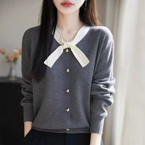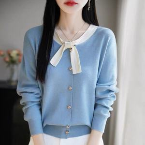 时尚蝴蝶结撞色精仿针织衫开衫女外套毛衣2025新款高级感上衣外搭