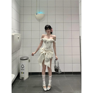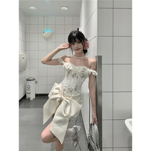 法式新款纯欲名媛精致蕾丝一字肩设计上衣显瘦蝴蝶结半身裙两件套