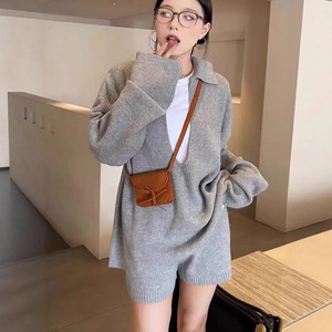 慵懒松弛感V领毛衣套装女秋冬新款宽松显瘦休闲针织衫短裤两件套