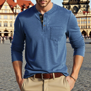 跨境大码美式男士秋季弹力彩棉休闲复古简约宽松亨利衫长袖T恤衫