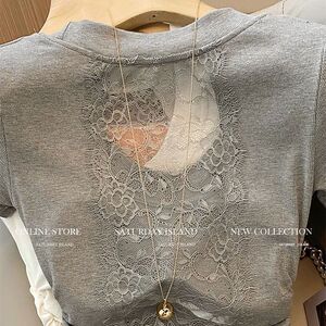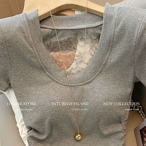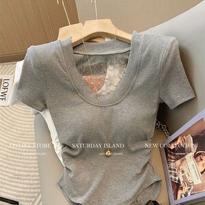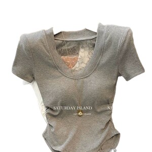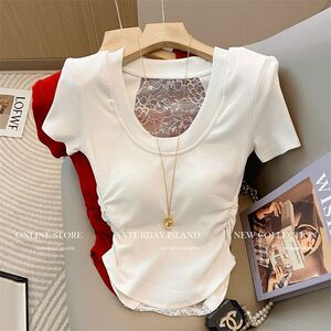法式设计感蕾丝拼接U领短袖T恤女2025夏新款纯欲风褶皱收腰小上衣