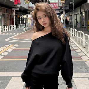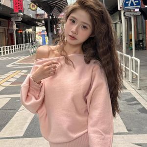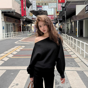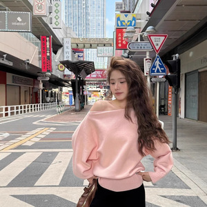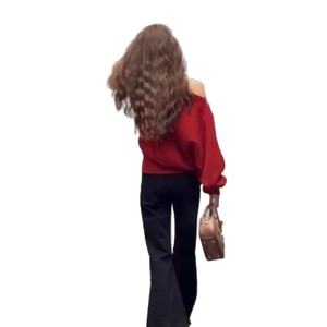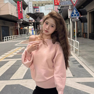 Knitted sweater woman韩系气质斜肩红色长袖针织衫女秋冬一字肩